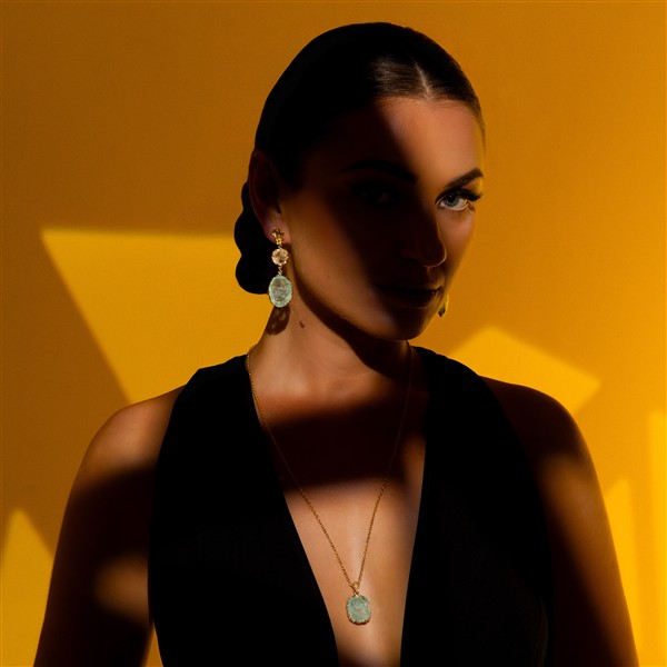 Este anillo está elaborado artesanalmente en plata con baño de oro, y un cuarzo menta talla cojín que evoca aguas cristalinas y paisajes de ensueño. Su montura presenta la icónica textura floral y vegetal de la Colección Oniria, abrazando la gema como si brotara de un paisaje mágico.