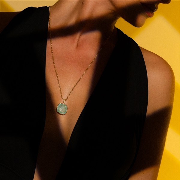 Este colgante está elaborado en plata dorada 925mls. y cuarzo menta. El colgante tiene unas medidas de 30x20mm. La cadena de plata dorada 925mls. tiene una longitud regulable hasta 80cm. con un cierre con pieza ajustable corrediza en plata dorada 925mls.