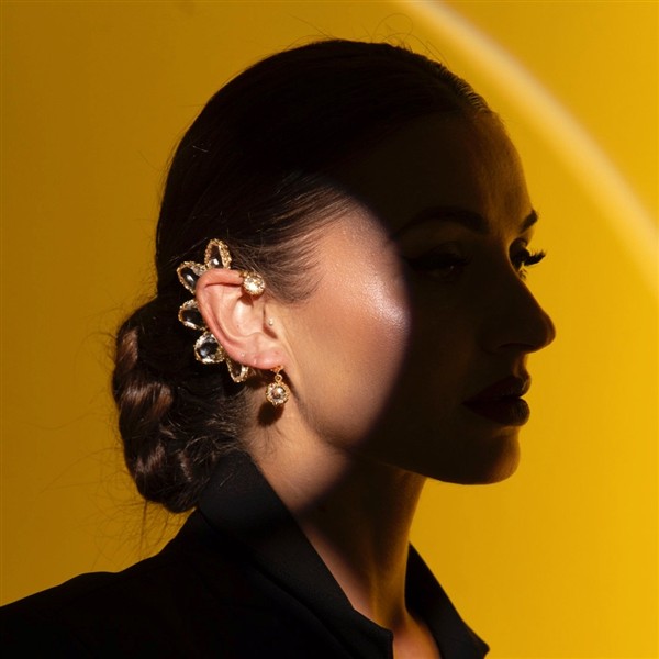 Este pendiente es una de las piezas más emblemáticas de la Colección Le Jardin de Clorì: un ear cuff que parece surgir directamente de un sueño, donde la luz se fragmenta en visiones y la naturaleza se transforma en joya. Su silueta orgánica con cuarzos transparentes se despliega como una rama fantástica que abraza la oreja derecha con un efecto etéreo y sofisticado.