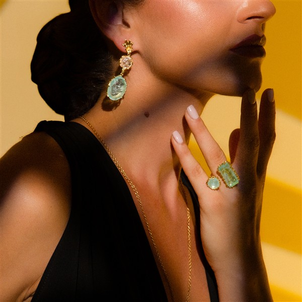Estos pendientes son una joya que invita a soñar despierta, un talismán de color y delicadeza. Unos pendientes de doble caída elaborados en plata dorada con un luminoso cuarzo blanco y un cuarzo menta que aporta un brillo fresco y etéreo sobre una textura de acabado orgánico. Una combinación luminosa que captura la esencia onírica y artesanal de la colección.