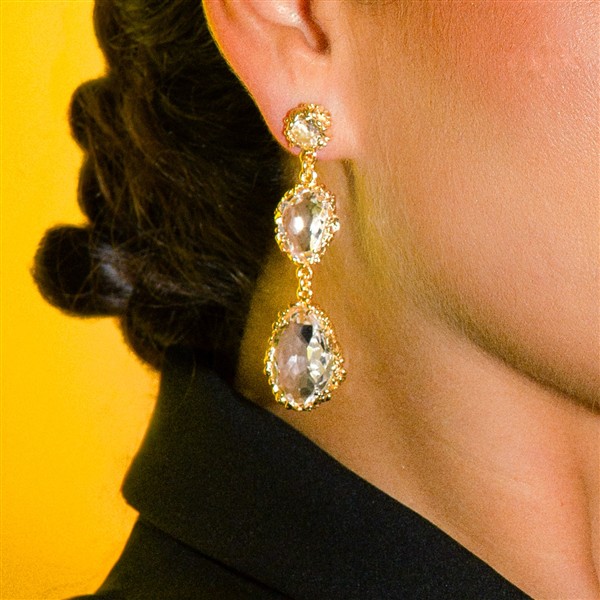 Estos pendientes están realizados en plata dorada 925 mls. y cuarzo transparente. Cada pendiente tiene unas medidas de 65x20mm y su cierre es de presión.