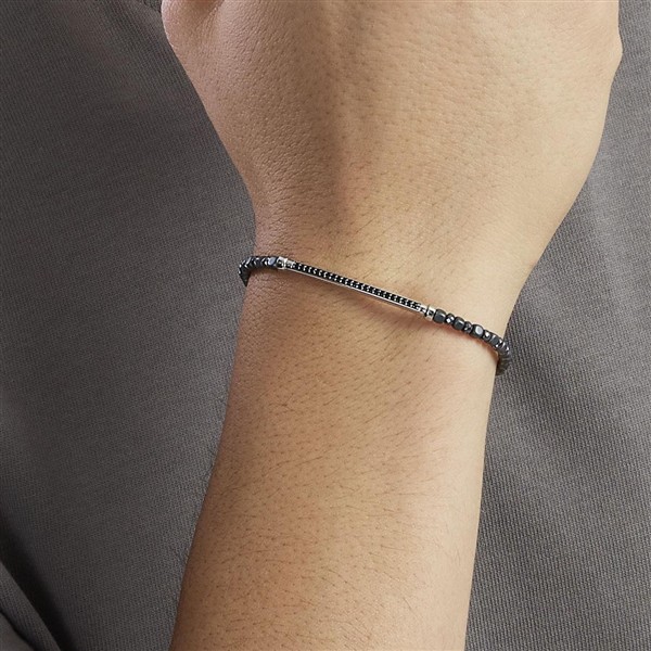 Esta pulsera está realizada en plata 925mls., hematite gris y circonitas negras. La pulsera tiene un largo de 20cm. y su cierre es de tipo mosquetón.